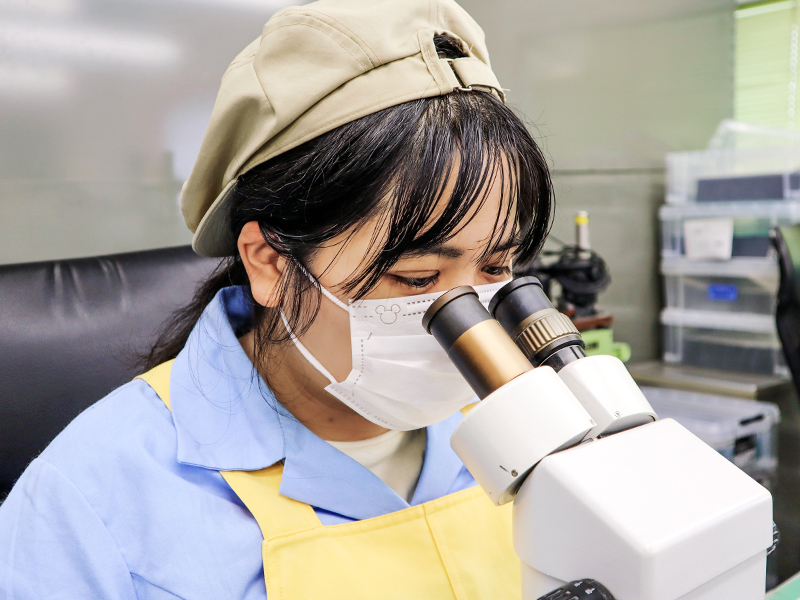 製品の仕上がりを、目視のほか顕微鏡や測定器を用いて検査します。万一に発生した不良を出荷しないよう、厳しい目で見極める最後の砦ともいえるセクションです。